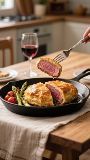 一只手正用银色餐叉叉起一块切开的菲力牛排,牛排呈现出粉嫩多汁的三分熟内里,表面覆盖着焦香的烤痕并撒有翠绿的香草碎,下方是黑色铸铁烤盘,盘中整齐摆放着其余切好的菲力牛排块,配以烤至金黄的小土豆块和鲜嫩的西兰花,整体置于木质餐桌上,背景是带有暖色调灯光的优雅西餐厅环境,光线柔和地洒在食物上,营造出精致诱人的美食氛围,色彩以深棕、暖黄、翠绿和牛排的粉嫩红色为主,光影层次丰富,突出食物的质感和新鲜感。