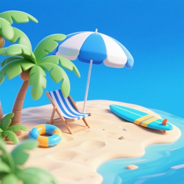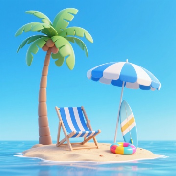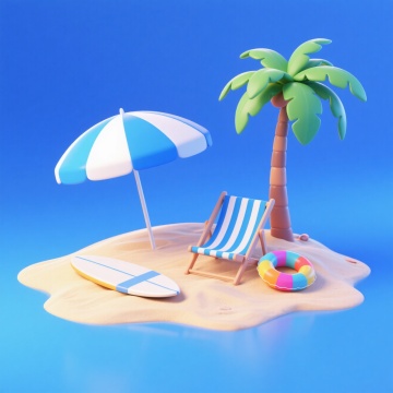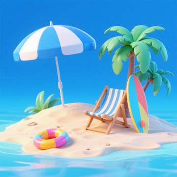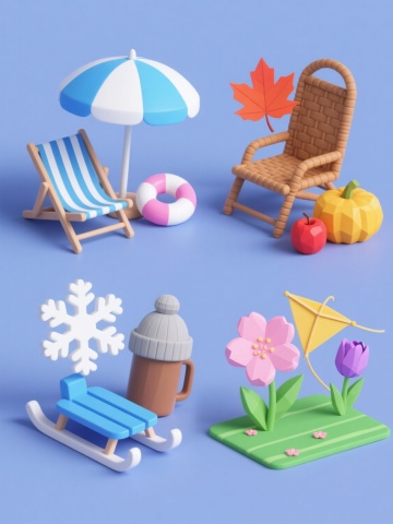 3D渲染风格的简约现代设计,六组规整排布的夏季海滩素材,每组包含不同样式的遮阳伞(如蓝白条纹伞面、蓝白波浪纹伞面、纯色浅蓝色伞面等),搭配木质框架的蓝白条纹沙滩椅、蓝白相间的沙滩球、蓝紫色渐变救生圈、米色草帽等元素,所有物体保持清晰的3D质感与平滑过渡的色彩,统一采用纯净的白色纯色背景,无任何文字、logo及水印,整体构图均衡对称,光影柔和自然,营造出清爽明快的夏日氛围。