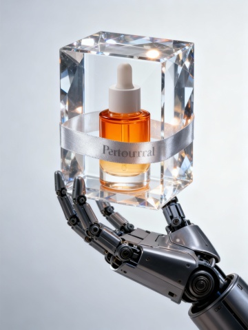 一瓶巨大的高端面霜内部有一个微型实验室,工厂生产线正在生产面霜,工人们正在忙碌,生产线延伸出来,源源不断的面霜运出;高端整洁