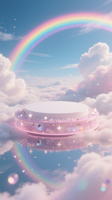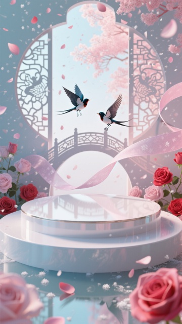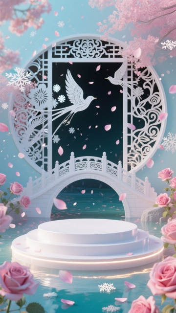 梦幻粉蓝色圆形展台,展台后面有两只很小喜鹊飞在鹊桥之上相会,花瓣雨,背景是粉蓝色星云,光感 生成了3次,感觉还是第一次好。一开始写的是太阳光感,黄色加进去画面整体很亮,就是一个太阳有点多余,后期P掉也可以用~就酱吧