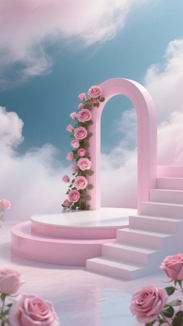 粉色拱门与玫瑰,云端背景,梦幻浪漫,软3D风简约设计。