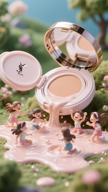 3D风微缩艺术,甜美梦幻波普设计,可爱女孩环绕唇膏,节日氛围浓厚。