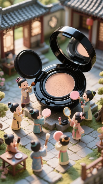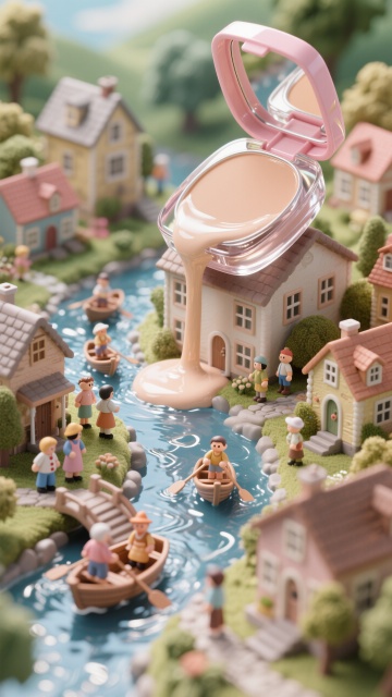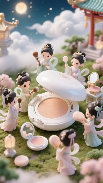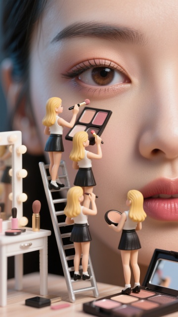梦幻感与甜美感交织的微缩艺术风场景,3D卡通人物环绕城堡式眼影盘,镜中浮现大眼,粒子飘散如星河,重拟物设计搭配粘土质感,营造虚拟现实般的童话氛围。