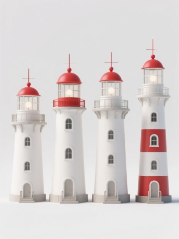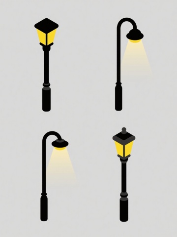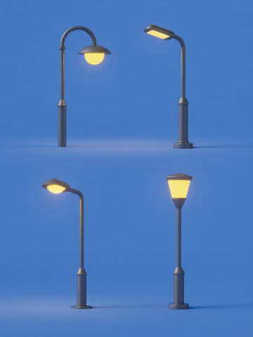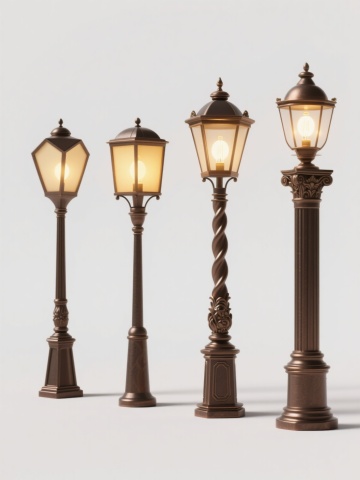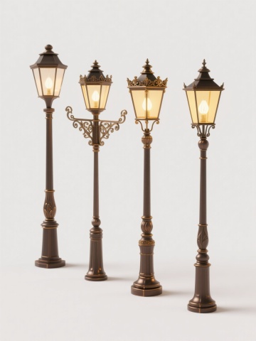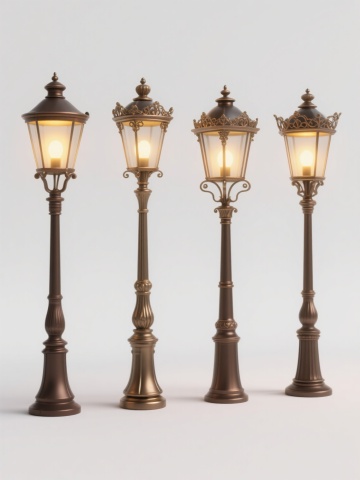 四个不同款式的复古路灯,每个路灯具有独特的灯柱设计和灯罩形状,统一采用高清晰度写实摄影风格,纯色背景,整体色彩变换为深蓝色调,元素类目保持为路灯,规整排布在画面中,无水印和文字。