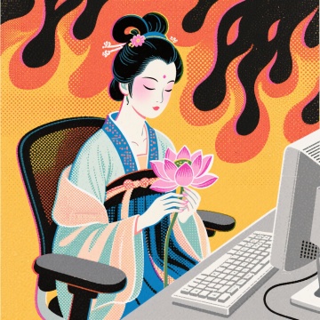 身着传统官服(类似古代官员服饰 )的女人,头戴古典官帽,坐在现代办公椅上,面前是办公桌、纸笔等办公物品,身处现代办公室环境(有隔断、办公设备 )。人物表情生气,用复古印刷网点质感,营造传统形象与现代办公碰撞的奇妙氛围,似展现古代角色处理现代工作的反差感 。