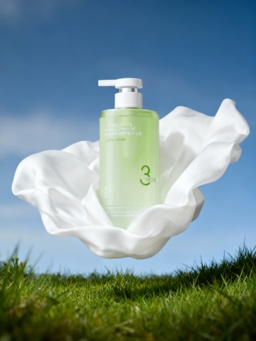 清新绿意中,3D玻璃风瓶身置于草丛礼盒,轻拟物设计融合虚拟自然,简约主义演绎清爽舒适感。