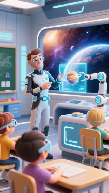 梦幻3D教室,卡通人物乘飞船遨游,超现实星球背景,营造虚拟现实学习氛围。