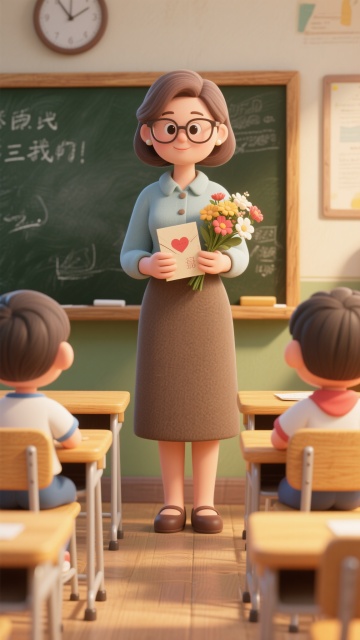 温馨软3D风,卡通教师手捧鲜花与贺卡,教室场景洋溢节日祝福氛围。