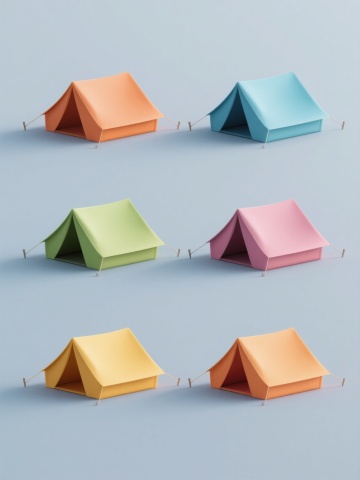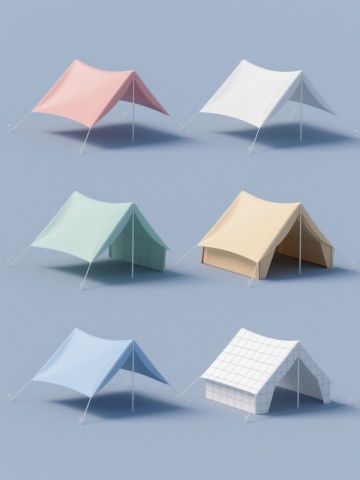 六个不同样式的3D遮阳伞,采用简约现代风格,纯色背景,无文字无logo无水印,每个遮阳伞具有独特的设计元素,伞面色彩明快,伞架线条流畅,整体造型规整排布,呈现出立体感和层次感,光影效果柔和自然,营造出简洁而时尚的视觉氛围。