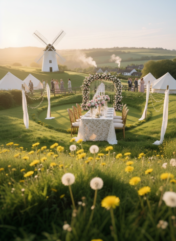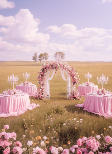 户外花园派对场景,白色帷幔搭建的帐篷下,悬挂着粉色、蓝色、金色和白色的气球拱门,气球下方点缀着金色亮片装饰。白色长桌铺着褶皱桌布,桌上摆放着多层甜点塔、马卡龙、水果挞、奶油蛋糕,中央是粉色和白色玫瑰花束插在白色花瓶中,周围散落着透明玻璃杯和金色餐具。背景有缠绕着串灯的树木,阳光透过树叶洒下柔和光线,整体氛围明亮、浪漫、温馨,充满庆祝的喜悦感