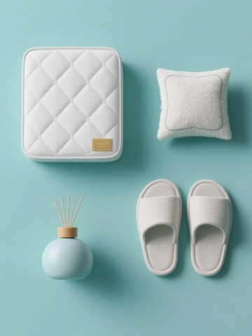 一张柔软的床垫,床垫主体为白色,表面有波浪形的凹凸纹理,床垫底部为灰色,边缘有浅棕色的边框,床垫上摆放着三个白色的枕头和一个米色的靠垫,枕头和靠垫摆放整齐,床垫放置在浅灰色的地毯上,地毯上有菱形的花纹,床垫的左侧有一个白色的床头柜,床头柜上放着一本书,床垫的右侧有一盆绿色的植物,植物的叶子细长,植物旁边有一个黄色的花盆,床垫的背景是一面米黄色的墙,墙上挂着一幅黑白相间的装饰画,画的下方有一个白色的床头柜,整个场景光线明亮,营造出一种温馨、舒适、简约的居家氛围。