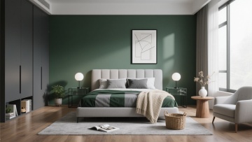 3D渲染的现代简约风格卧室,低饱和度墨绿色与暖灰色为主色调,柔和漫射自然光从右侧大面积落地窗洒入,木质地板温润有光泽,带有细微纹理。画面以床为视觉中心,床头采用浅灰色软包设计与深绿色墙面形成对比,床头两侧是黑色金属支架的玻璃台面床头柜,各放置一盏造型简约的白色球形台灯。床上铺着深绿色与灰色条纹的床单,搭配几个不同材质的灰色抱枕和一条米色针织毯随意搭在床尾。床尾正对着一面悬挂着抽象几何线条装饰画的墙,画框为黑色细边框。左侧墙面嵌入一整面墙的深灰色推拉门衣柜,衣柜底部设计有开放式展示格,摆放着几本精装书和一个小型绿植盆栽。右侧窗边设有一个浅灰色布艺单人沙发,沙发旁是一个原木色小圆几,上面放着一个白色陶瓷花瓶,里面插着几支干花。地面铺着一块浅灰色短绒地毯,地毯上随意散落着一本翻开的杂志和一个编织篮。整个空间光影层次丰富,阴影柔和,营造出宁静舒适且极具现代设计感的休憩氛围,视觉层级清晰,信息传达简洁高效,符合现代都市年轻人群的审美需求。