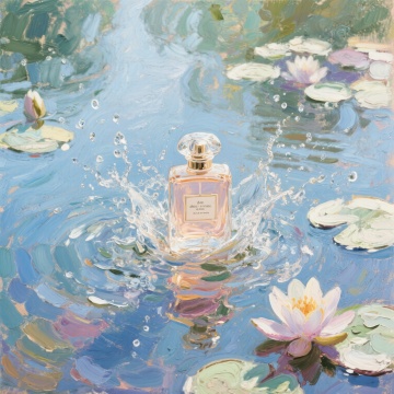油画风香水瓶落水瞬间,水花四溅,睡莲环绕,光影交织,清透梦幻,静谧浪漫,厚涂笔触呈现唯美感与优雅气息。