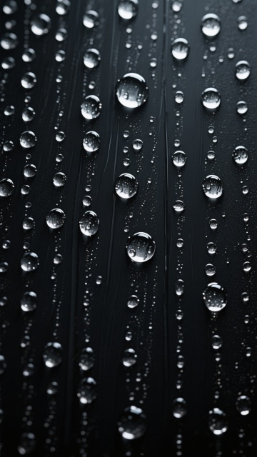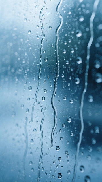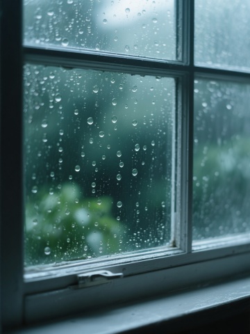 写实摄影风格,雨天室内窗边场景,玻璃窗上布满大小不一、晶莹剔透的水珠,水珠表面有细微反光,玻璃边缘有金属或塑料窗框的硬朗线条,窗外是模糊的深绿色植物背景,光线柔和偏冷色调,营造出宁静、略带忧郁的氛围,近景聚焦于玻璃上的水珠质感,景深较浅,背景虚化,整体画面湿润而富有细节,具有真实的生活气息和雨天特有的静谧美感。