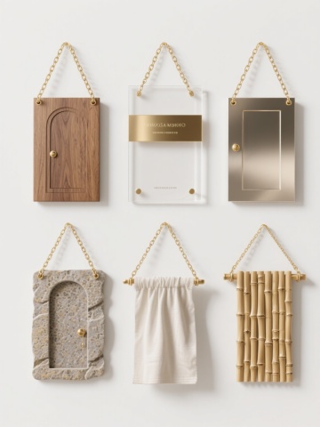 白色背景上,整齐排列六个不同样式、不同风格、不同材质的门牌。第一个门牌为金色金属材质,具有古典对称的卷草纹边框,边缘有红褐色描边,表面光滑有金属光泽,呈现出3D立体效果,光影过渡自然,高光和阴影细节丰富,整体风格华丽典雅。第二个门牌为木质材质,呈深棕色,表面有清晰的木纹肌理,边框为简约的直角线条,带有复古做旧处理,边角有轻微磨损感,风格质朴自然。第三个门牌是现代简约风格的亚克力材质,透明蓝色,无边框设计,表面光滑通透,有轻微的反光效果,显得时尚清新。第四个门牌为石材材质,浅灰色,边框为不规则的自然石纹形状,表面粗糙有颗粒感,呈现出原始自然的风格。第五个门牌是布艺材质,米白色布料,边缘有精致的蕾丝花边装饰,整体柔软轻盈,风格温馨浪漫。第六个门牌为黑色金属材质,工业风设计,边框为粗犷的直线条,表面有磨砂质感,带有铆钉装饰,风格冷峻硬朗。所有门牌大小相近,以两行三列的整齐布局排列,保持统一的视觉平衡和间距,整体构图简洁有序,信息传达清晰,具有良好的设计感和视觉层次。