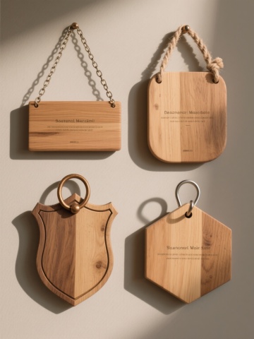 四个不同造型与样式的木制挂牌系列素材集合,保持原木材质的自然纹理与温暖色调,分别采用:1. 带弧度边角的长方形木牌,搭配精致雕花边框与细链条悬挂;2. 复古拱形顶木牌,顶部装饰简约叶纹雕刻,配粗麻绳悬挂;3. 双层叠加大小不一的梯形木牌,边缘做旧处理,配金属环与短链条;4. 六边形木牌,表面带有横向凹槽纹理,配皮质绳带悬挂。所有木牌均保持相同的文字内容区域,整体在纯色背景上呈规整矩阵排布,光影统一为柔和的顶部光源,营造出和谐且富有层次变化的木质装饰标牌系列感。