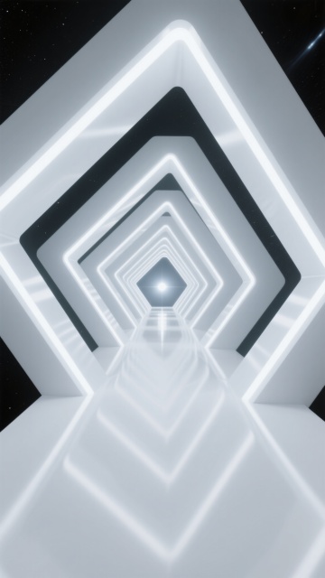 极简主义未来感空间场景,纯净白色调为主,由重复排列的几何立体结构构成深邃的隧道式空间,边缘镶嵌明亮的白色线条光源,光线柔和均匀地照亮整个空间并在地面形成清晰反射,营造出无限延伸的纵深感和宁静神秘的科技氛围,顶部和两侧墙面呈现出规则的几何切割面,整体风格简洁、现代、具有强烈的空间透视感,符合太空主题的空旷与科技感。