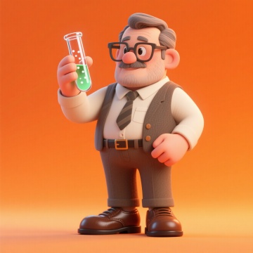 卡通感十足的软3D风设计,老人手持试管,橙色背景突出科学实验的趣味性。