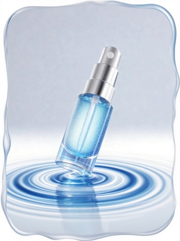 水中间有一个玻璃展台,展台中央放置着一瓶透明蓝色的洗发水,瓶身晶莹剔透,蓝色液体在瓶中微微晃动,周围是清澈的水面,光线从上方照射下来,在玻璃展台和洗发水瓶上形成明亮的反光和折射效果,水面平静,倒映出展台和瓶子的轮廓,整体画面干净、通透,充满现代感和高级感