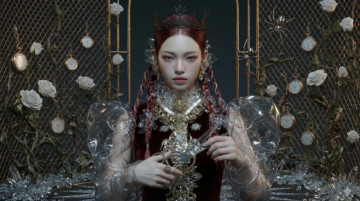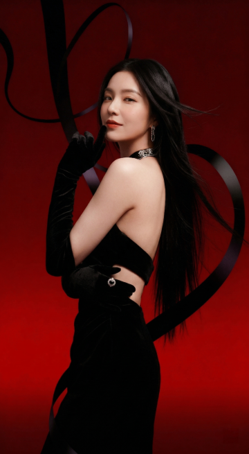 下雨夜晚,前景模糊,前景是保镖的肩膀和伞。画面中的主体是一位冷白皮御姐,轻熟风,正面。酒红色挑染长发发型,中分八字刘海,精致的妆容,丝绸衬衫,金属装饰品,黑色硬剪裁风格高定西装,黑色开叉高定长裤,细长金属棒耳饰,红唇冷笑,冷峻眼神,暗黑华丽风格。脖子一侧有大面积日式彩色纹身。昂贵金属手环,钻戒。右手姿势动作唯美,夹着香烟。神秘,冷漠,逆光,暗调背景。身后有很多穿着黑西装的保镖,场景设定在黑夜雨中的