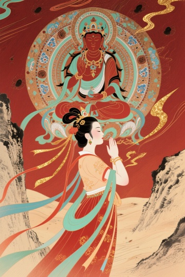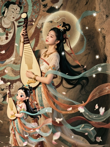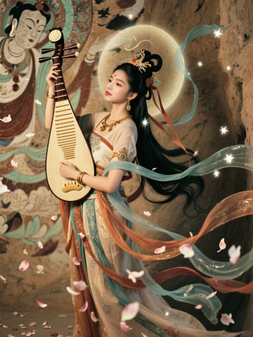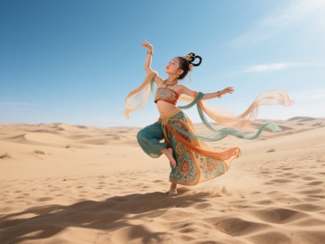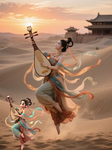 人物穿上敦煌舞者飞天造型衣服与发型,手拿琵琶在沙漠里,丝带环绕悬空仙气飘飘,背景是大沙漠,落日晚霞,远处的古风建筑,复古敦煌滤镜