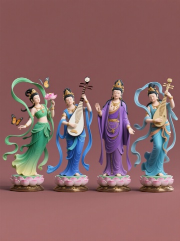 一组四幅规整排布的敦煌壁画风格系列素材,每幅均为纯色背景,保持唐代壁画特有的矿物颜料质感、古朴褪色效果、流畅飘逸的线条和装饰性图案风格。画面整体色彩分别变换为:1. 青绿色调为主,描绘反弹箜篌的伎乐天,身着青绿缠枝纹长裙,飘带呈淡蓝与白色;2. 赭红色调为主,展现吹奏笙箫的飞天,衣饰为赭红与明黄,点缀金色纹饰;3. 石蓝色调为主,刻画手捧莲花的供养菩萨,身披石蓝与月白袈裟,莲花为粉白渐变;4. 土黄色调为主,呈现手持琵琶起舞的乾闼婆,服饰为土黄与赭石色,飘带为浅褐与米白。所有人物姿态各异,均保持敦煌壁画的典型造型特征、面部神态和传统纹样,元素类目统一为佛教伎乐天/飞天/菩萨形象,整体构图平衡对称,四幅画面风格高度统一,仅通过主色调和所持乐器/物品形成区分,构成系列感。