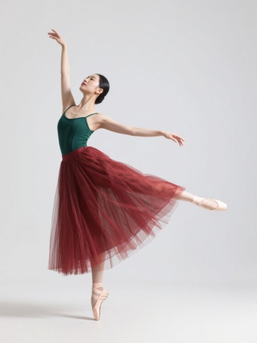 一位亚洲女性舞者,身着淡蓝色薄纱长裙,裙摆呈多层荷叶边设计,上身搭配同色系紧身抹胸,她正单腿站立呈阿拉贝斯克舞姿,另一条腿向后伸直抬高,双臂优雅舒展,一手高抬指向斜上方,一手自然下垂,头部微微后仰,眼神专注而陶醉,白色纯净背景,高清摄影,柔和顶光,细腻皮肤质感,纱裙轻盈飘逸的动态感,肢体线条流畅优美,整体画面呈现出高雅、灵动、专业的艺术氛围。