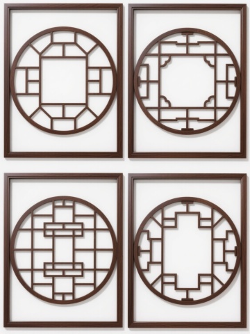 一个精美的中式实木屏风,整体呈深棕色,具有古典的弧形顶部设计和雕花底座。屏风为四扇折叠式结构,两侧的屏风保留原有的竖条纹格栅样式,中间两扇屏风则变换为新的样式:左侧中间屏风上描绘着一幅雅致的水墨山水画,画面中有远山、近树、亭台楼阁和一叶扁舟;右侧中间屏风则以工笔花鸟为主题,展现了盛开的牡丹和几只栖息在枝头的鸟儿。整个屏风设计古朴典雅,线条流畅,雕花精美,放置在纯白色的背景中,营造出宁静悠远的东方韵味。