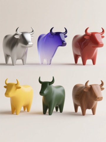高分辨率摄影风格,6个不同配色、不同样式、不同材质的「牛」造型,浅色背景,上下两行对齐排列,每个牛造型具有独特的色彩搭配、设计样式和材质质感,光线明亮柔和,整体画面简洁清晰,突出牛造型的多样性和细节,适合用于展示或设计参考。
