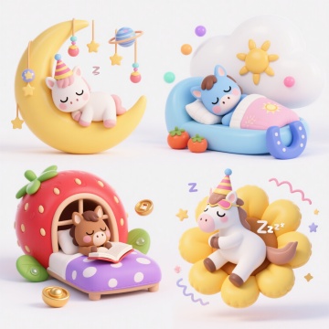 软3D风格的拟人小马,萌趣酣睡于月亮、草莓屋、云朵与花朵之上,搭配卡通元素与梦幻色彩,营造温馨可爱的童话氛围。