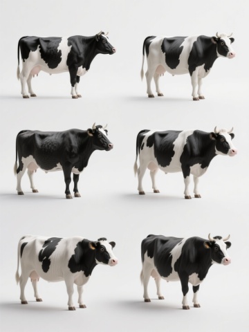 白色背景上,六个不同动态与场景的3D卡通奶牛角色系列素材集合,保持圆润Q版造型、白棕黑配色、柔和渐变光影与细腻材质感,每个奶牛姿态各异:1. 举着奶瓶的站立奶牛 2. 趴在草地上的奶牛 3. 戴着蝴蝶结的微笑奶牛 4. 抱着干草堆的奶牛 5. 戴着牛仔帽的挥手奶牛 6. 坐在牛奶桶上的奶牛,所有角色等距规整排列成两行三列,整体风格统一且充满可爱童趣。
