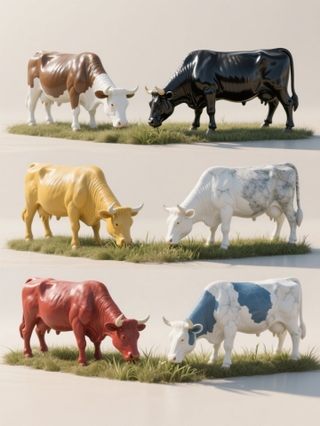 超写实摄影风格,浅色背景上,上下两行各三头对齐排列的牛造型,六只牛姿态统一为低头吃草,每只牛拥有独特配色(如棕色与白色、纯黑色、黄色与白色、灰色与白色、红色与白色、蓝色与白色)和不同材质质感(光滑亮泽的漆面、粗糙的陶土、金属拉丝、柔软的毛绒、磨砂质感的塑料、光滑的大理石纹理),牛的身体结构精准,肌肉线条清晰,皮毛纹理细致,草地上的草叶锐利分明,光影效果自然,光源来自左上方,牛身左侧有明亮高光,右侧形成柔和阴影,整体画面干净整洁,信息传达直接,突出牛造型的多样性与材质对比。