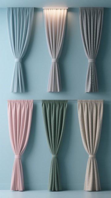 高写实3D渲染的不同配色、样式、材质的窗帘,纯色背景,整体艺术风格为超写实数字艺术,主色调呈现多种纯色选择(如静谧蓝、温柔粉、高级灰、典雅米、深邃绿),色彩纯净饱和且和谐统一,光影运用采用柔和的顶部主光源,光线强度适中,营造出细腻的阴影细节和自然的高光表现,材质分别展现丝绸的光滑垂坠感、棉麻的质朴纹理、雪尼尔的柔软绒感、纱帘的轻盈通透感,窗帘形态呈现垂坠式、褶皱式、水波帘、罗马帘等多种样式,构图布局为居中对称,视觉焦点集中在窗帘本身,展现其优雅的垂坠弧度和丰富的褶皱层次,氛围宁静而精致,无任何文字、LOGO、二维码及多余装饰元素。