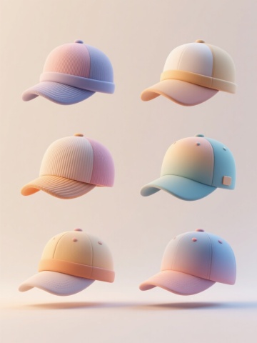 3D风格渲染的帽子设计展示图,六个不同配色、不同样式、不同材质的帽子造型,采用上下两行对齐排列,整体呈现柔和的卡通感,每个帽子都有细腻的纹理和渐变色彩,立体感强,高光和阴影处理柔和自然,背景为浅色,简洁干净,突出帽子主体,设计风格统一且富有变化,展现出帽子的多样设计可能性。