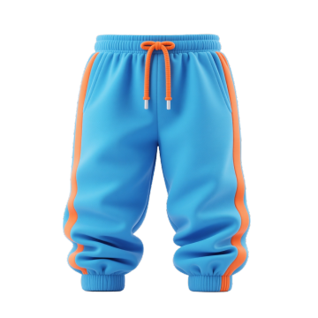 男士运动束脚裤,卡通风格,高饱和色彩,亮蓝色裤身搭配橙色条纹,裤脚抽绳设计,立体褶皱,柔软材质质感,纯净白色背景