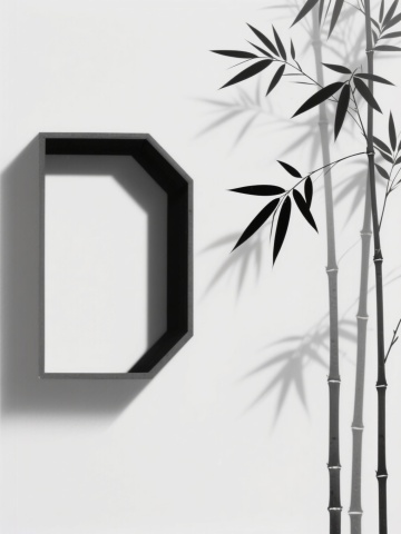 极简主义窗景剪影,白色背景上灰色竹枝竹叶影子呈几何分割窗框结构,线条简洁流畅,光影层次分明,竹枝影子自然舒展,宁静禅意东方美学,高对比黑白灰配色,干净利落边缘,现代简约构图,含影子元素的干净背景素材用提示词