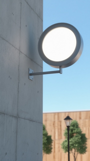 3D渲染风格的灯箱展示图,浅灰色带有细腻颗粒质感的水泥墙面背景,浅灰色地面,柔和均匀的漫射光源从上方照射,在灯箱底部和基座边缘形成轻微的阴影过渡,高光柔和不刺眼。一个现代简约风格的灯箱,其形状变换为流畅的圆角矩形,样式设计为双层结构,外层为纤细的哑光浅灰色金属边框,内层为半透明磨砂亚克力面板,内部发出均匀柔和的白色光芒,灯箱底部连接一个低矮的、与边框同色系的梯形基座,整体呈现出简洁、高级、通透的设计感,画面构图采用居中对称布局,灯箱位于画面中央,四周留有适当留白,突出灯箱主体。