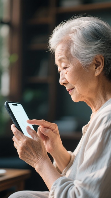 写实风中融入皮肤与布料肌理,光影柔和,展现老人使用手机的温馨瞬间,质朴而舒适,传递日常中的温暖关怀。