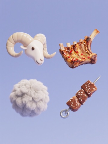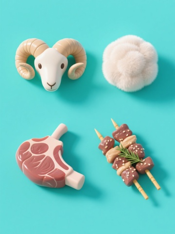 soft 3D style, series of four different roasted lamb elements arranged in a neat grid on solid color background, each with distinct vibrant color scheme, first element: whole lamb horn with smooth gradient texture and delicate shadows, second element: roasted lamb leg with crispy golden-brown skin and juicy meat details, third element: sliced lamb chops with grilled marks and seasoning particles, fourth element: lamb skewers with metal sticks and evenly distributed meat cubes, cohesive soft 3D rendering, clean composition, high visual hierarchy, each element maintaining consistent soft lighting and rounded edges, vibrant color transformation for overall画面, realistic texture details, modern poster design aesthetic