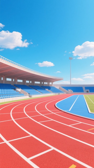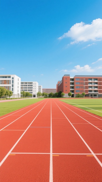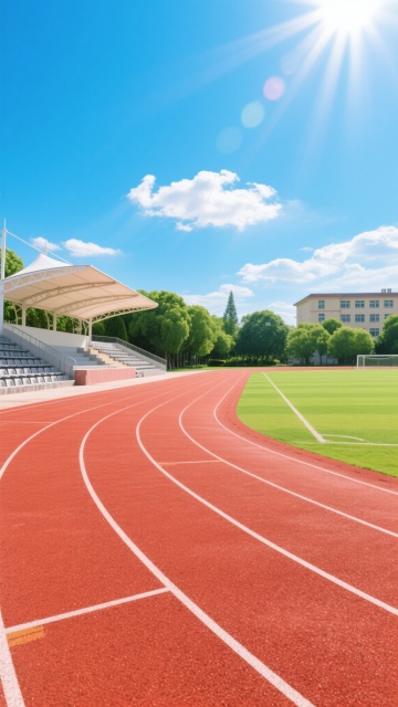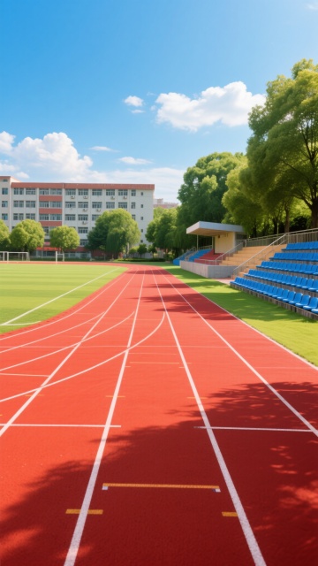 阳光明媚的晴朗白天,明亮的蓝色天空中点缀着几朵白云,阳光从画面左上方照射下来,形成清晰的光影效果,展现一个常规学校操场的场景。前景是红色塑胶跑道,表面有细腻的颗粒质感,白色分道线清晰笔直,跑道呈现自然的弯道曲线。跑道内侧是修剪整齐、色泽鲜亮的绿色草坪足球场。左侧远处是带有灰色座椅的白色顶棚看台,看台后方和右侧背景是茂密的绿色树木,远处还有一栋浅色的教学楼建筑。整体画面采用写实摄影风格,色彩鲜艳饱和,光线充足,具有清晰的景深效果,近景跑道细节锐利,远景建筑和树木稍显模糊,营造出开阔、整洁、充满活力的校园运动氛围。