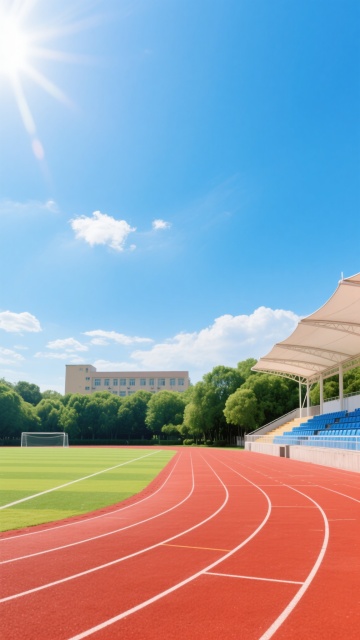 一个常规学校操场的写实摄影照片,画面以红色塑胶跑道为前景,跑道上有清晰的白色分道线,呈现出优美的弧形延伸至远方。跑道内侧是修剪整齐的绿色草坪足球场。左侧可见带有蓝色座椅的露天看台,顶部有白色的遮阳棚结构。背景中是茂密的绿色树木,远处有一栋浅色的教学楼。画面采用低角度仰拍构图,天空占据上半部分,呈现出明亮的蔚蓝色,点缀着少量白色云朵。阳光从左上角照射下来,在跑道和草坪上形成清晰的光影效果,整个场景明亮通透,充满活力与青春气息,展现出校园运动场地的整洁与开阔。