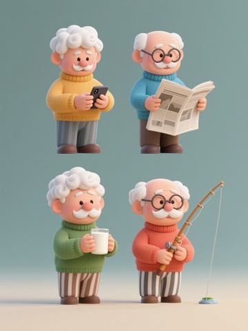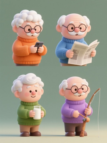 4个不同年龄段卡通人物的系列集合,采用3D立体Q版风格,圆润可爱的造型,柔和的光影处理,平滑的材质过渡,纯色背景,规整的网格排布。包括:白发戴眼镜的老年男性(蓝色开衫、白色衬衫、棕色裤子、绿色鞋子)和白发盘髻的老年女性(橙色上衣、棕色裙子、橙色鞋子);穿着商务休闲装的中年男性和女性;时尚装扮的青年男性和女性;穿着活泼童装的小男孩和小女孩。所有人物都有大大的眼睛、微笑的表情,色彩明快和谐,整体保持统一的可爱卡通设计感,适合作为系列素材使用。