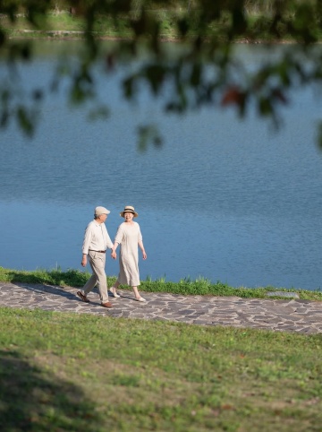 一对头发花白的老年夫妇在不同的户外场景中温馨互动的画面,背景可以是公园的林荫道、湖边的长椅、山间的小径或宁静的花园等。两位老人面带温暖灿烂的笑容,神情愉悦自然,老爷爷穿着浅灰色的长袖针织衫,老奶奶穿着米色的高领内搭和同色系的开衫马甲,老奶奶手中捧着一个白色的茶杯,老爷爷的手臂亲切地搭在老奶奶的肩上,两人姿态亲密和谐。画面整体采用写实风格,光线明亮柔和,以自然光为主,呈现出温暖的色调,绿色的植物背景郁郁葱葱,充满生机,营造出宁静、幸福、安逸的氛围,整体构图清晰,主体突出,细节丰富,具有生活气息和情感温度。
