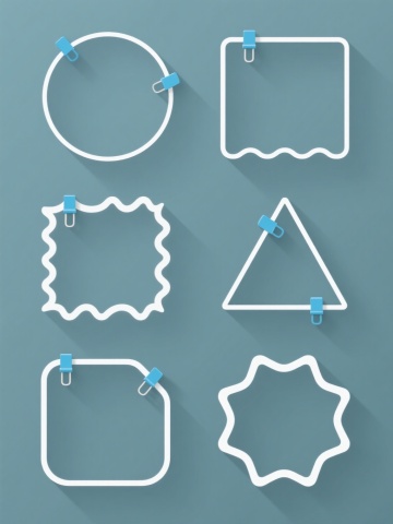 极简风格的6个不同形状文本框系列素材集合,每个文本框均采用线条勾勒的简约设计,保持圆角矩形轮廓基础上融入完全不同的几何变形,包含圆形边角、波浪边框、三角形切角、梯形结构、齿轮边缘和多边形轮廓,每个文本框配有两个对称的蓝色回形针固定装饰,整体以纯色背景呈现,6个文本框采用完全不同的配色方案且无任何文字,所有元素规整排布成网格状,保持线条的平滑过渡和阴影的微妙层次感,体现现代简约的设计美学。