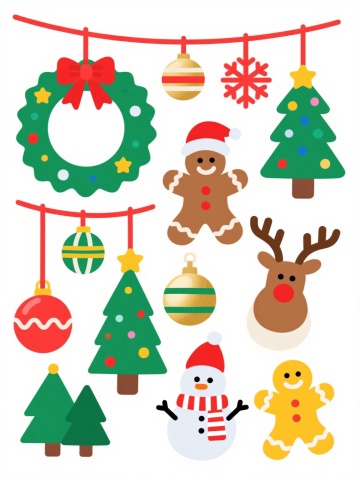 六个具有3D立体风格的圣诞元素集合,每个元素采用完全不同的材质,造型统一,规整排布在纯色背景上。元素包括:顶部带金色星星、挂有彩色球和拐杖糖的圣诞树;戴着绿色围巾、怀抱心形礼物、有棕色鹿角和红色脸颊的驯鹿;装满礼物、顶部有姜饼人、装饰有冬青叶和红色浆果的红色圣诞袜;系有金色铃铛和冬青叶的红白条纹拐杖糖;棱角分明、线条清晰的白色雪花;戴着红色圣诞帽和条纹围巾、有胡萝卜鼻子和红色手套的雪人。材质分别为:光滑塑料质感的圣诞树,哑光陶瓷质感的驯鹿,毛绒布料质感的圣诞袜,金属光泽质感的拐杖糖,透明水晶质感的雪花,柔软针织质感的雪人。整体色彩鲜艳明快,保持原图的圣诞氛围和元素特征,光影效果柔和,立体感强,各元素间距均匀,构图平衡。