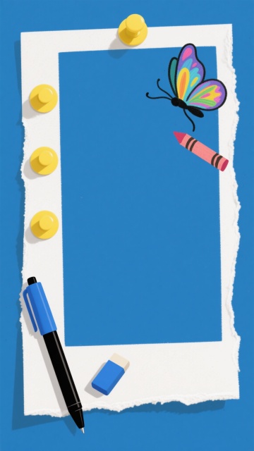 一张手绘风格的空白便签纸,纸张边缘带有自然的毛边质感,背景为纯净的深蓝色。纸张顶部用三个绿色的回形针固定,左上角有一个简笔画风格的白色纸飞机,纸飞机尾部带有黑色的飞行轨迹线条。右下角放置着一支蓝色的马克笔和一个灰色的笔帽,整体构图简洁明快,充满轻松的创意氛围,线条勾勒简约流畅,色彩对比鲜明,呈现出随性而不失设计感的手绘插画风格。