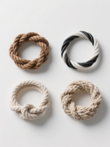 纯白纯色背景上,规整排布四个完全相同造型的波浪线元素,每个波浪线保持原始流畅的连续曲线形态,线条宽度均匀一致,首尾为平直截断设计。从左至右、从上至下(或横向并排)依次呈现四种截然不同的材质质感:第一个为光滑细腻的哑光陶瓷材质,呈现柔和的淡蓝色,表面有细微的颗粒感;第二个为高反光金属材质,呈现银白色,带有强烈的高光和明暗对比,反射周围环境;第三个为半透明磨砂玻璃材质,呈现淡青色,边缘有清晰的轮廓光,内部有细微的纹理;第四个为柔软的编织布料材质,呈现深蓝色,表面有明显的经纬纹理和轻微的褶皱感。整体构图简洁对称,四个波浪线元素大小一致,间距均匀,保持统一的视觉风格和布局,无任何文字、LOGO或二维码。