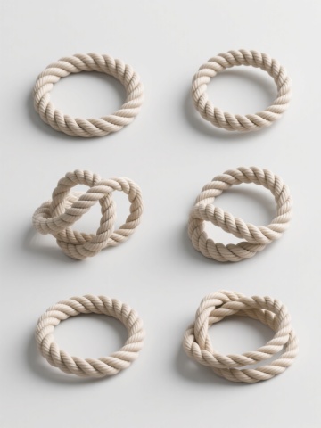 六个完全相同造型的金色圆环元素,分别采用六种不同材质呈现——哑光磨砂金属、光滑镜面不锈钢、复古做旧铜锈、透明水晶玻璃、温润珍珠母贝、哑光陶瓷质感,每个圆环拥有独特的专属色彩,整体以规整的网格布局排列在纯白色纯色背景上,保持统一的简约现代设计风格与清晰的视觉层级,所有圆环元素均为纯图形无任何文字信息。