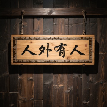 一块悬挂在深色木板拼接墙面上的原木色牌匾,牌匾边缘有黑色回纹雕花装饰,牌匾中央以遒劲有力的黑色书法字体书写“人外有人”四个大字,整体呈现出古朴自然的中式风格,木质纹理清晰可见,光影柔和,营造出沉稳庄重的氛围。