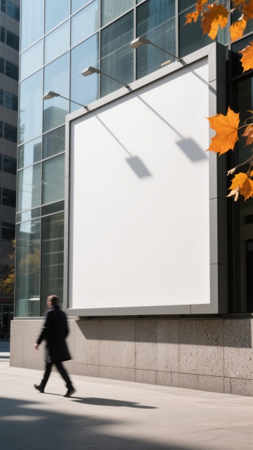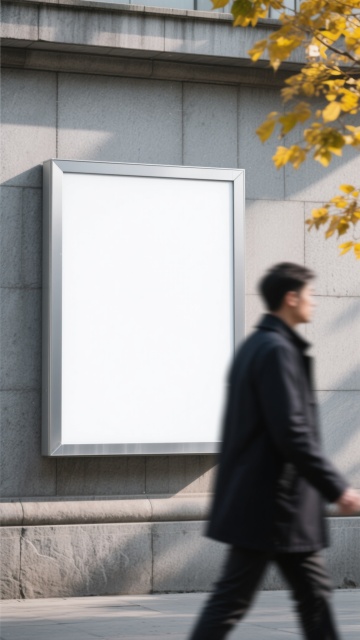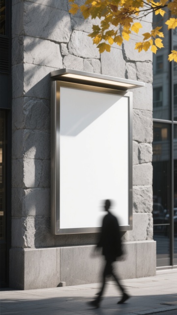 一个大型的空白灯箱广告,安装在灰色的石材外墙上,灯箱有银色的边框,灯箱内部是纯白色的。灯箱的右侧有一些黄色的树叶,一个穿着深色外套的人正从灯箱的左侧走过,人物有些模糊,营造出一种动态的感觉。整个画面采用了写实的摄影风格,光线柔和,阴影清晰,色调以灰色和白色为主,营造出一种现代、简约的氛围。